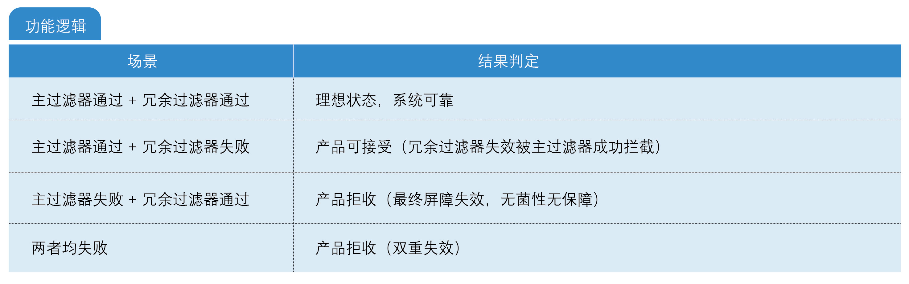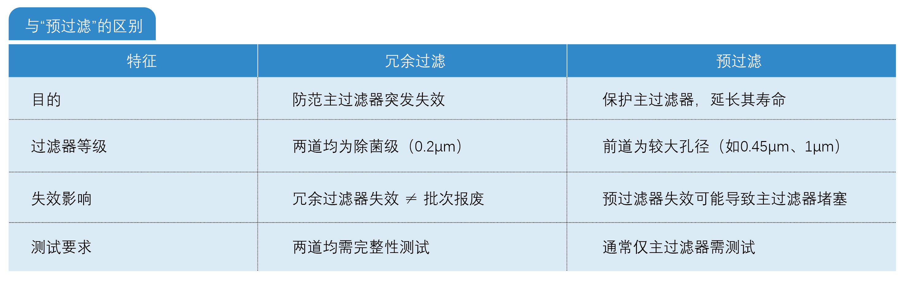●應(yīng)對突發(fā)失效:針對主過濾器在過濾過程中可能發(fā)生的無法預(yù)知的瞬時(shí)失效(例如震動(dòng)導(dǎo)致的膜破裂、安裝密封意外松動(dòng))。 ●不替代常規(guī)驗(yàn)證:冗余設(shè)計(jì)無法防范因過濾器選擇錯(cuò)誤、工藝參數(shù)超限、產(chǎn)品兼容性問題等系統(tǒng)性風(fēng)險(xiǎn)。 3. 核心要求 ●同級(jí)規(guī)格:冗余過濾器與主過濾器必須均為除菌級(jí)(LRV≥7),且材質(zhì)、孔徑、尺寸一致。 ●獨(dú)立完整性測試:兩道過濾器需在過濾后分別進(jìn)行完整性測試(如氣泡點(diǎn)試驗(yàn)),以確認(rèn)各自狀態(tài)。