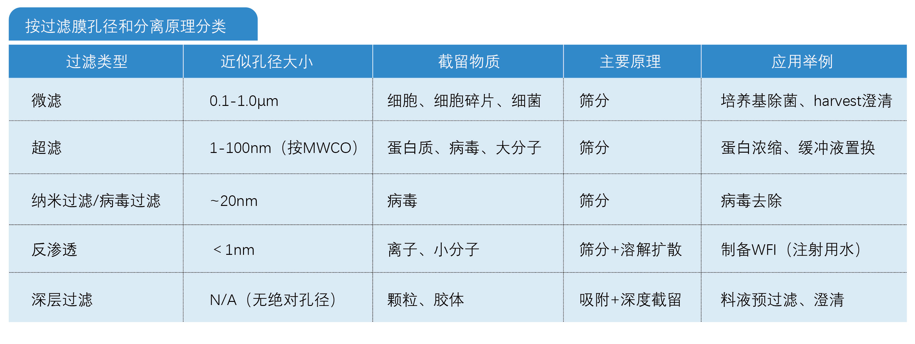 生物制藥中的過濾可以根據(jù)其目的、原理、工藝階段和膜孔徑等多個(gè)維度進(jìn)行分類。下面是一個(gè)系統(tǒng)性的梳理: